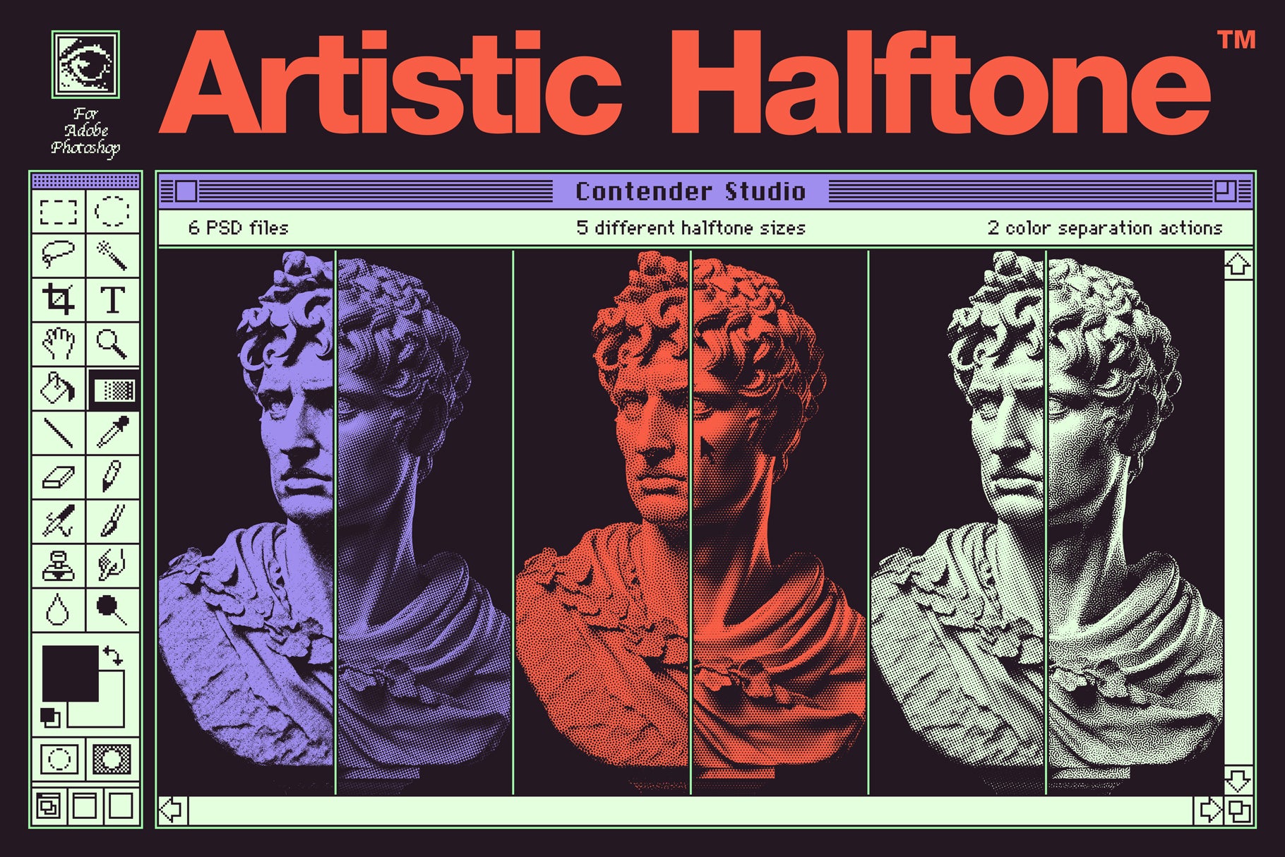 Leveraging advanced Photoshop Smart Object technology, the Contender Studio Artistic Halftone seamlessly converts your photos, text, vectors, illustrations, or 3D renders into an impressive array of stunning halftone patterns.