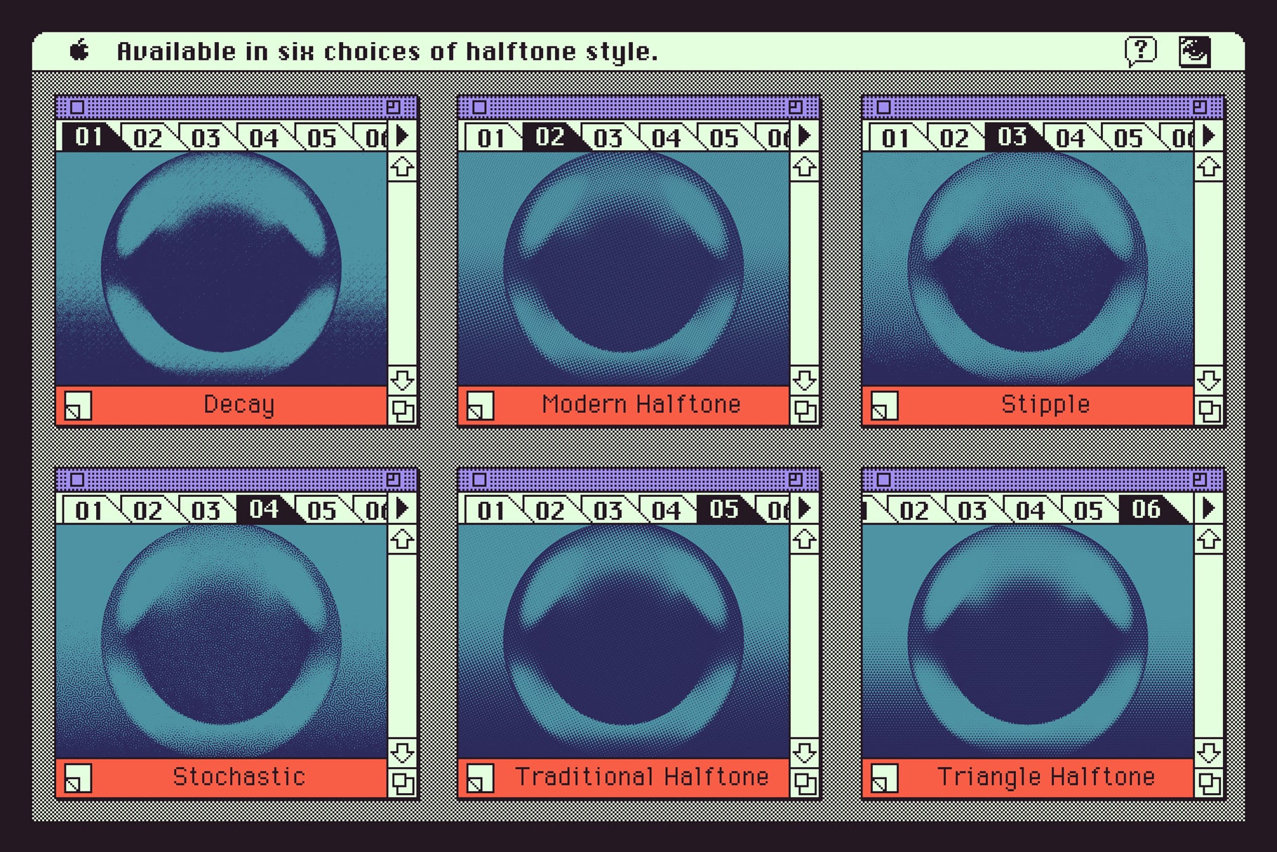 • 6 unique halftone styles. From classic and vintage-inspired halftones to modern and contemporary designs, this tool provides a diverse range of options to suit any artistic vision. Experiment with different styles to add depth, texture, and visual interest to your artwork, giving it a distinct and captivating look.