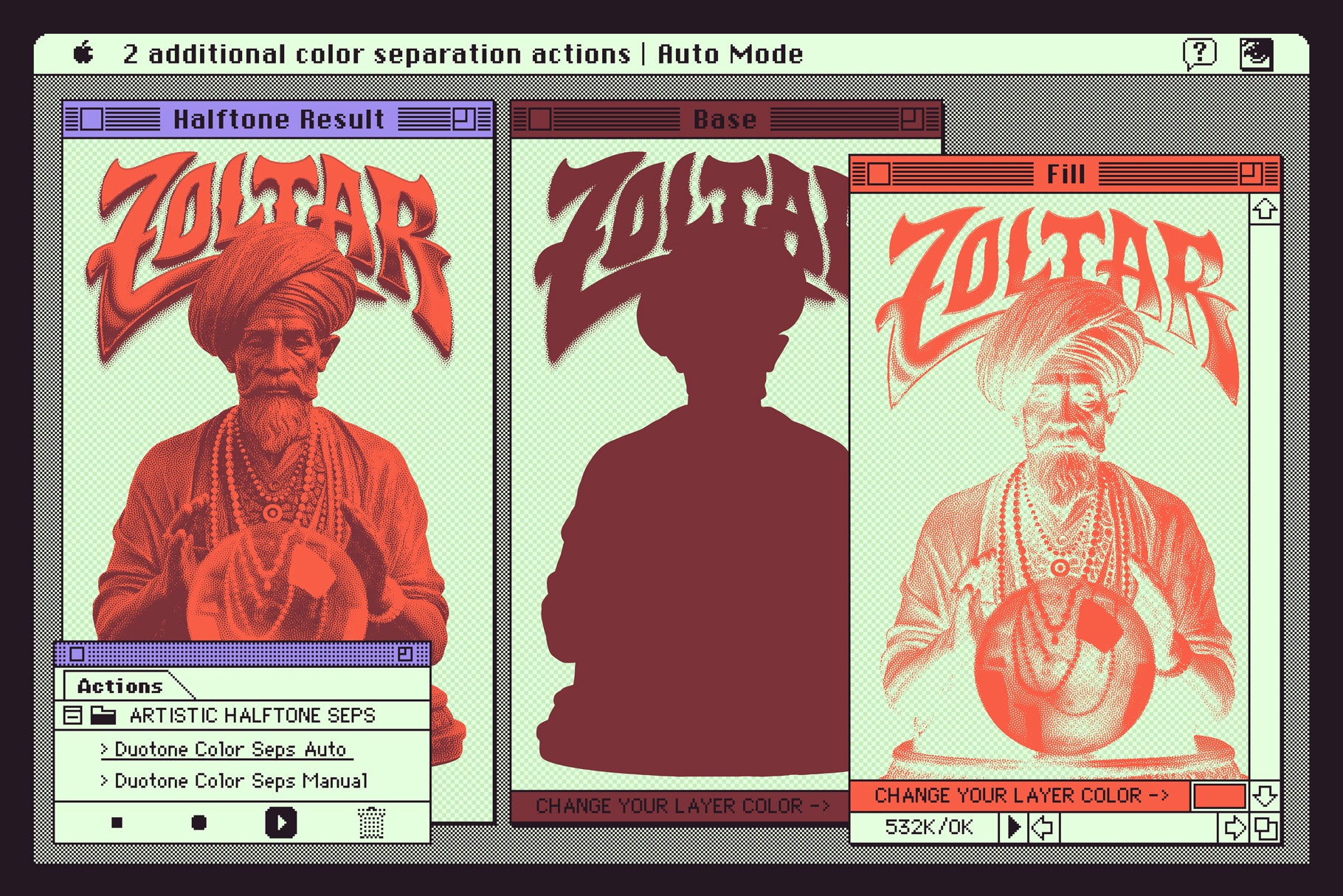 • 2 color separation actions, enhancing its versatility and functionality. These color separation actions enable you to effortlessly separate colors and customize the layer colors to match your desired vision.